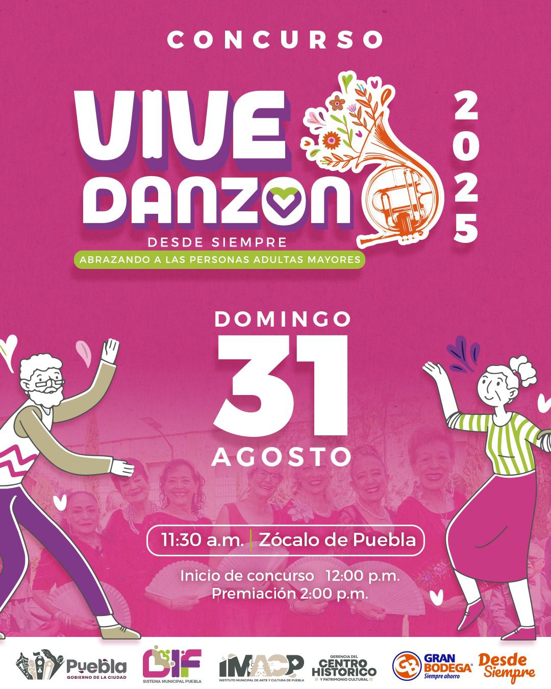 Puebla, Pue., 20 de agosto de 2025.- Como parte del compromiso que tiene la presidenta del Patronato del DIF Puebla Capital, MariElise Budib por apoyar y reconocer la labor de las personas adultas mayores, y en coordinación con el Instituto Municipal de Arte y Cultura (IMACP), la Gerencia del Centro Histórico y Gran Bodega, se llevará a cabo el primer “Vive Danzón: Desde siempre abrazando a las personas adultas mayores”, el próximo domingo 31 de agosto a las 12:00 horas en el Zócalo.